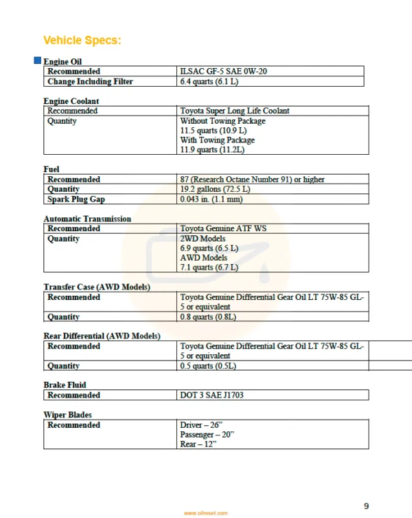 Detailed table with vehicle specifications, fluid specifications, light bulb part numbers, and tire specifications.